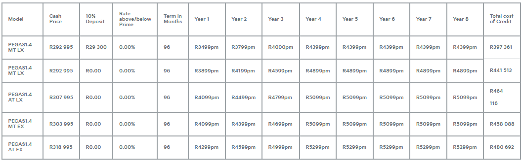 Move in style with the Pegas from only R3 499 p/m. Book a test drive today.